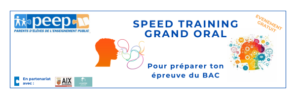 Le Speed Training Grand Oral est un projet humain passionnant pour maximiser les chances de réussite de terminales à l'épreuve du Grand Oral. Un projet mené par l'équipe de la Peep Aix et une formidable équipe de bénévoles qui se sont portés volontaire et se sont formés pour cette journée.